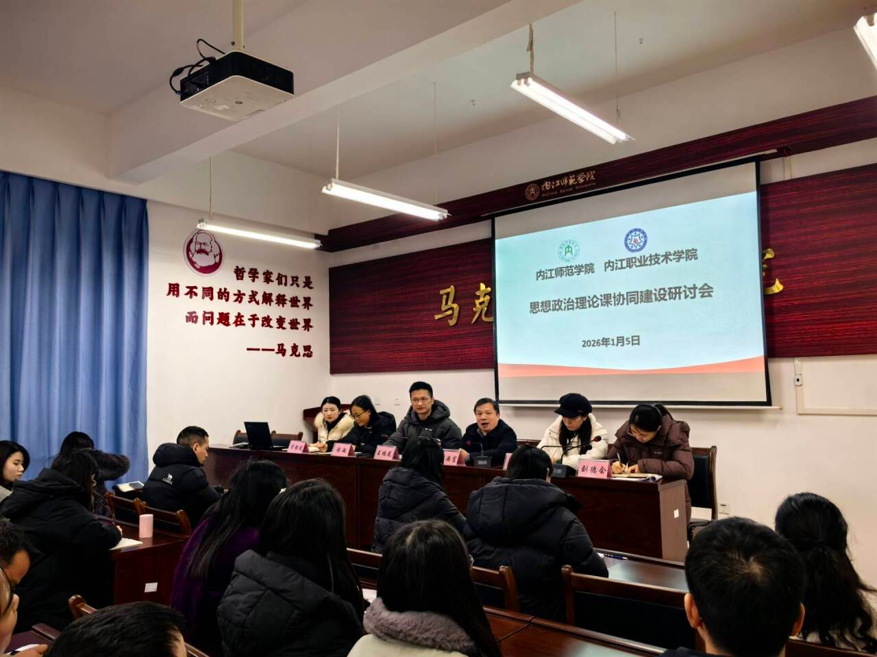为深化思想政治理论课改革创新,探索地方院校马克思主义学院特色发展路径,1月5日,内江师范学院马克思主义学院、内江职业技术学院马克思主义学院联合智慧树网,在弘文楼242会议室开展了思想政治理论课协同建设研讨会。内江师范学院马克思主义学院院长谭安富、副院长刘德会、管银凤,内江职业技术学院马克思主义学院书记王林龙、副院长谢敏、李翠,两校马克思主义学院相关教研室全体教师参会。会议由谭安富主持。