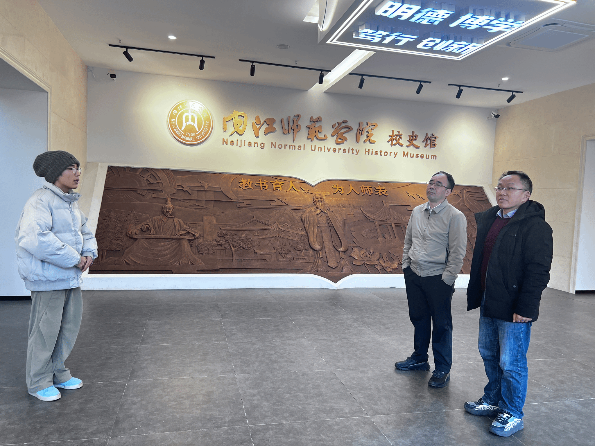 在内江师范学院马克思主义学院党委书记邓小明和党委副书记刘正丽的陪同下,胡书记参观了学校的校史馆,通过图文资料详细了解了学校的发展历程、办学特色及近年来取得的各项成果。随后,双方举行了座谈交流会。