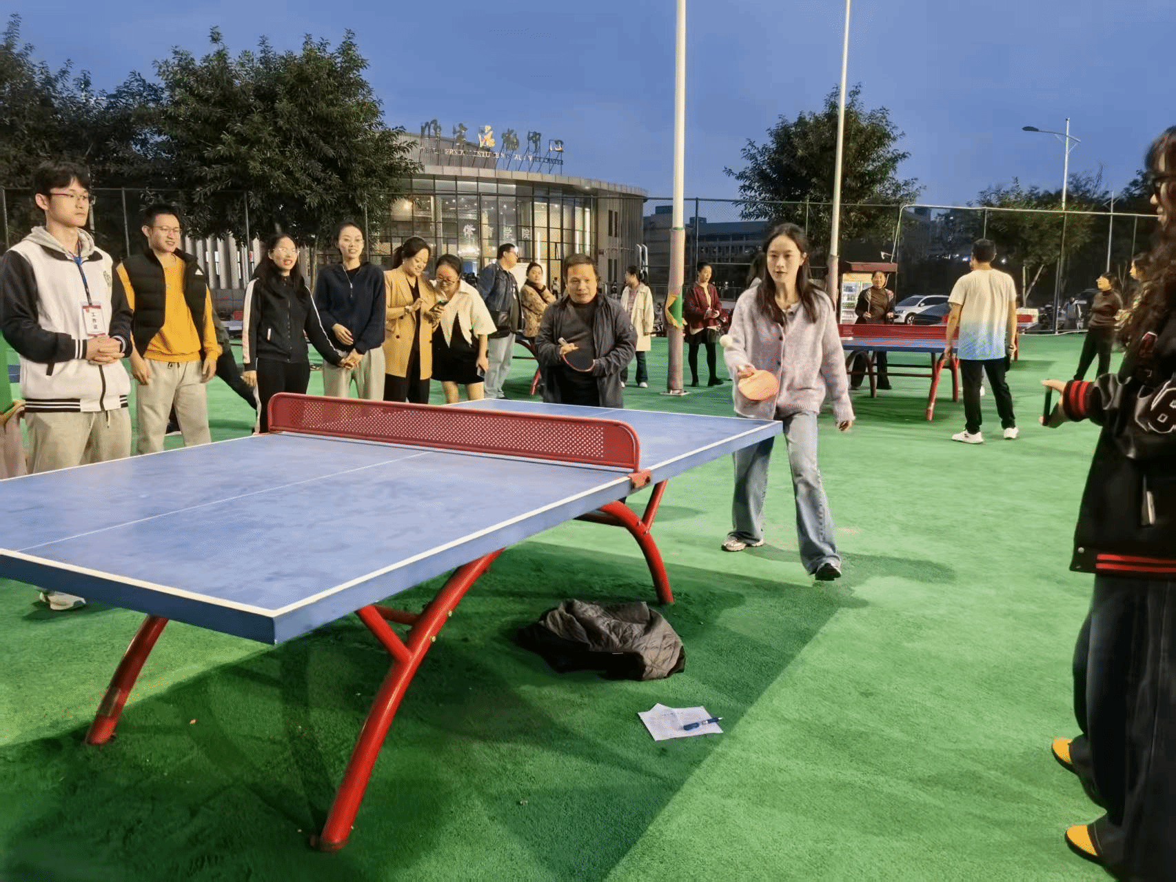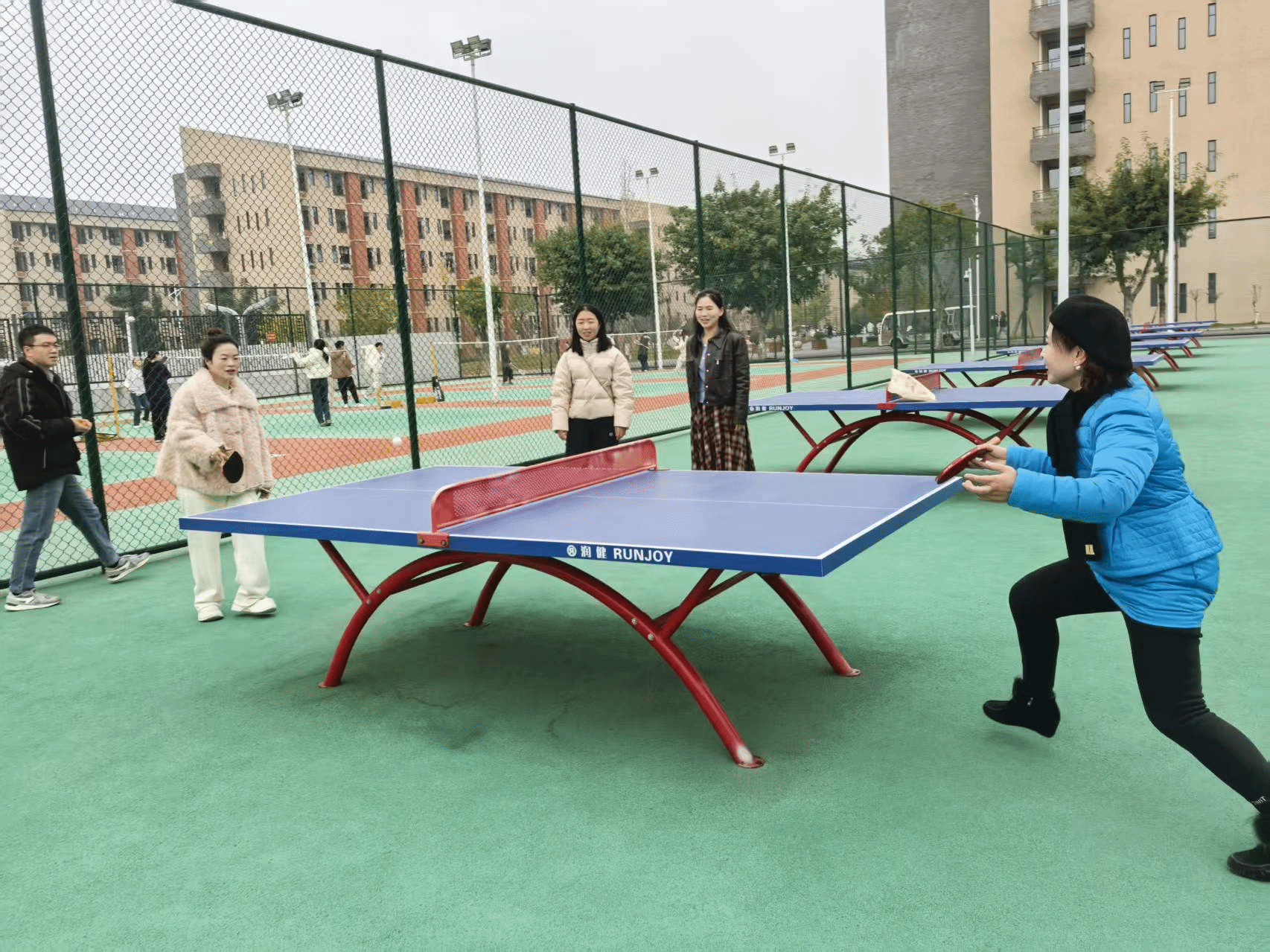 比赛在热热闹闹的氛围下拉开了序幕。随着裁判一声哨响,选手们手持球拍,怀着激动不已的心情,飞快地走位,各显神通。老师们平日工作的繁忙与压力,此刻一扫而空。各位老师高度专注、发球迅捷,击球稳健有力,每一次得分都获得了旁边围观的观众的热烈的掌声和喝彩声。