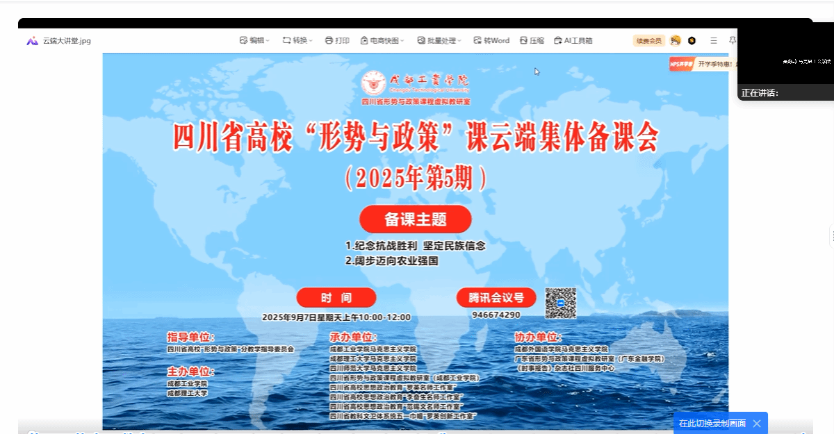 为进一步提升集体备课质量,增强课程的教学实效性,2025年9月,形势与政策教研室组织全体任课教师,通过线上方式参加了由四川省高校“形势与政策”课教学指导委员会指导、四川省形势与政策课程虚拟教研室主办的云端集体备课会。