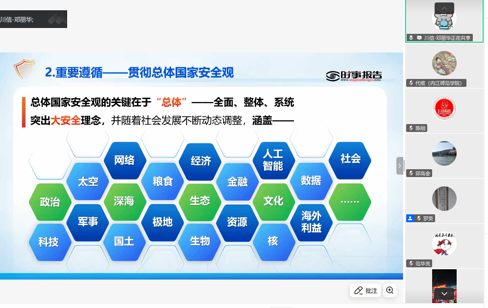 本次备课会以“聚焦建设更高平安中国”为主题,由四川信息职业技术学院青年教师邓丽华主讲。邓老师以“西贝预制菜”“蔡国强喜马拉雅烟花表演”等近期热点问题导入新课,随后从“加强党对平安中国建设的全面领导”“坚定不移贯彻总体国家安全观”“夯实平安中国建设的社会基础”“着力化解各类风险”“强化社会治安综合治理”等几个方面进行细致的讲解。最后邓老师指出,在新征程上,要坚定不移贯彻总体国家安全观,及时化解各类风险问题,筑牢人民安全基石。