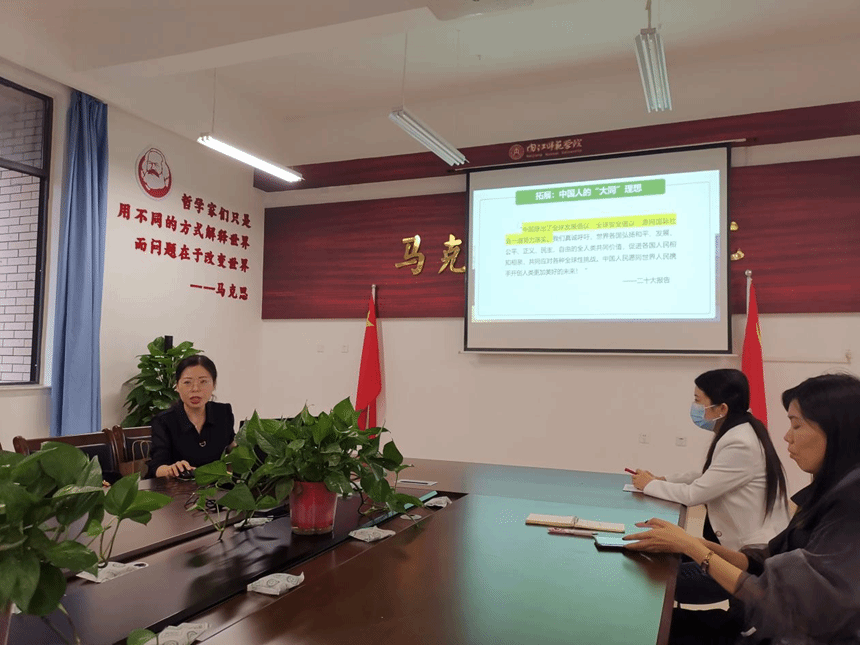 胡静老师提出,教研室老师应深刻透彻地学习报告,认认真真地领悟原理,坚定不移地笃定信仰,扎扎实实地宣讲精神,推动党的二十大报告内容进教案、进课堂、进学生头脑。