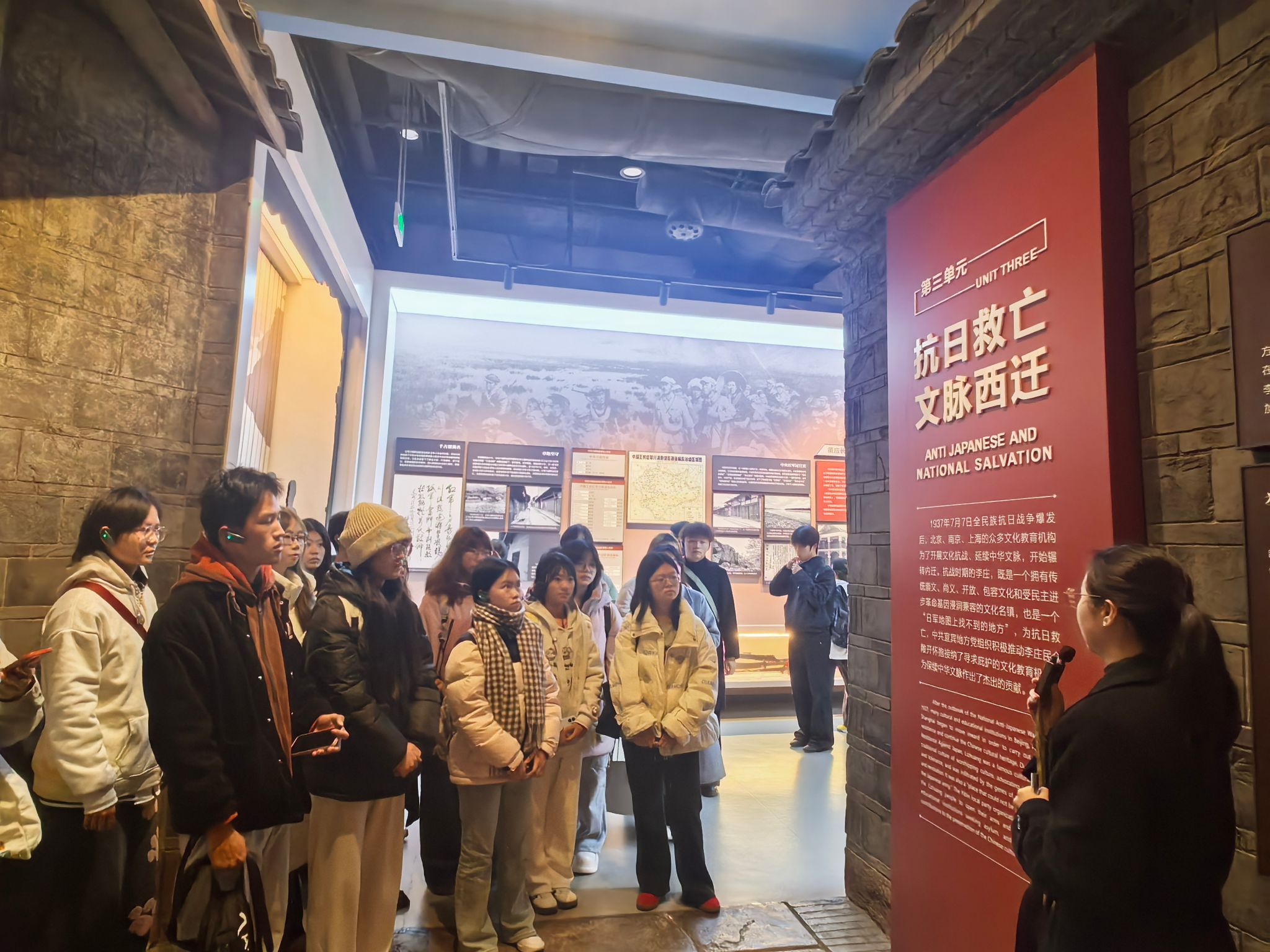在张家祠,师生们重点参观了“中央博物院旧址”陈列区,实地感受抗战时期文博工作者保护文物、传承文明的使命担当。张家祠作为当时中央博物院的临时存放地,珍藏过大量国家级文物,见证了中华文化“薪火相传、生生不息”的顽强生命力。教师们结合“思想道德与法治”课程中“传承中华优秀传统文化”“弘扬伟大民族精神”等教学要点,现场开展案例教学,引导学生从历史文化中汲取精神养分,深刻认识中华优秀传统文化的时代价值,增强文化自信与民族自豪感。