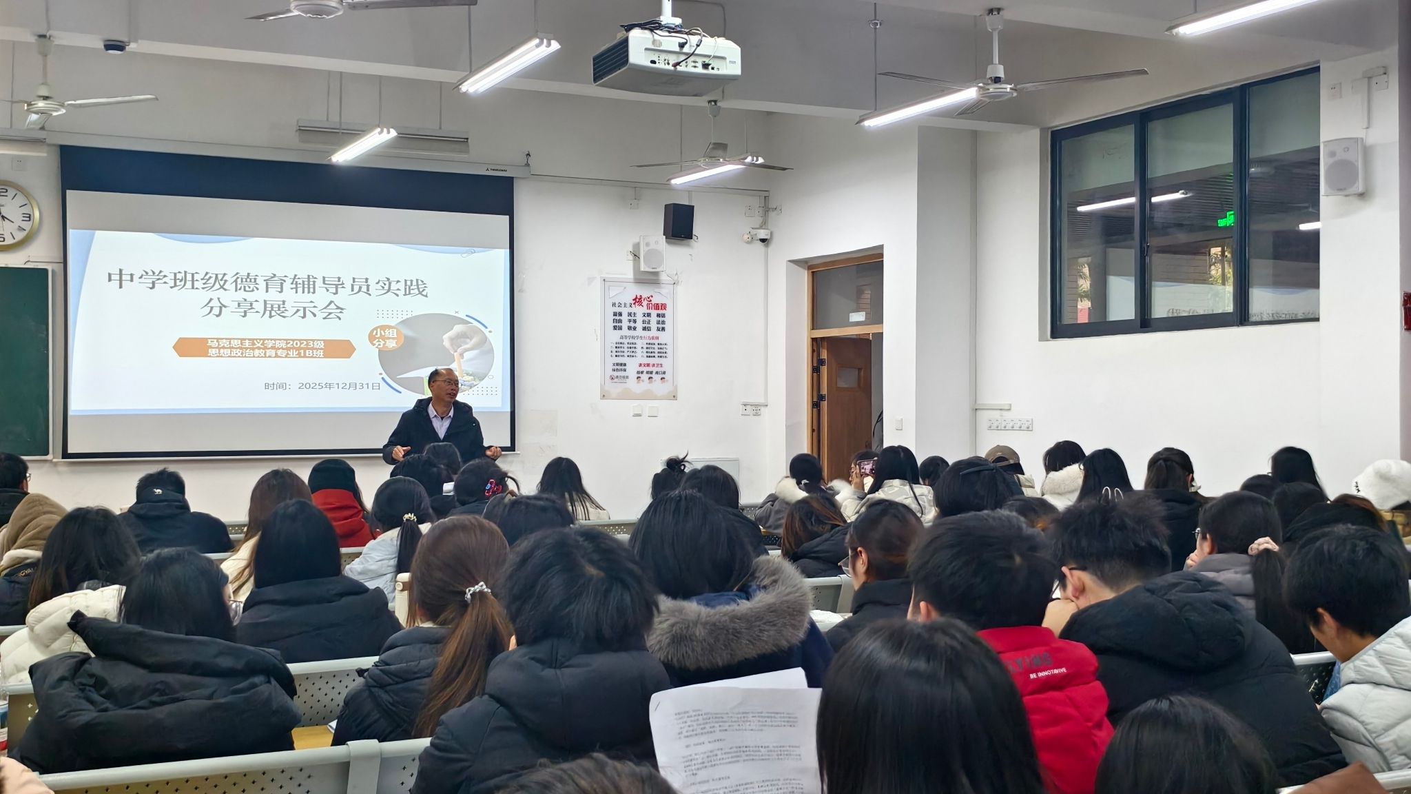 中学班级德育辅导员的一线实践蕴含着丰富的育人智慧,总结实践经验能为思政专业学子将来更好地开展教育教学工作奠定坚实基础。为此,我院于12月31日在明德楼B201、B101召开了中学班级德育辅导员实践活动分享展示会。课程负责人庞超教授、蒋兴巧老师及思想政治教育专业课教师朱锐锋,全体2023级思想政治教育专业学生参加了此次活动。