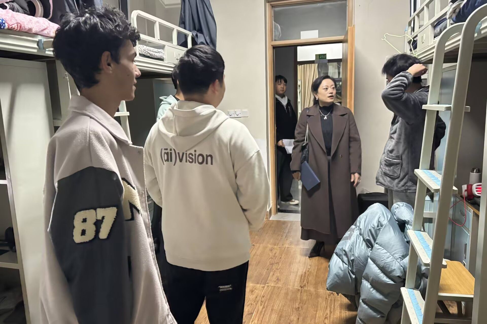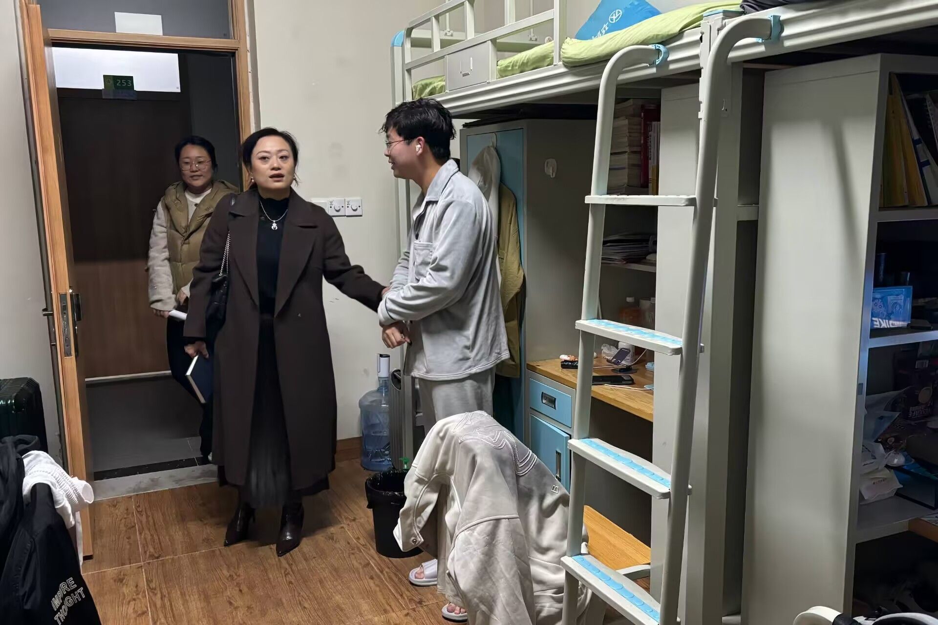 在走访过程中,老师们秉承“细致查、当面改、贴心讲”的原则,检查了寝室内用电设备、消防设施等安全隐患重点区域,对存在的消防安全隐患和卫生问题逐一记录并现场协调落实整改。同时,向同学们强调了安全用电、消防安全等注意事项,引导大家增强安全防范意识,维护安全有序的寝室环境。此外,在与同学们的交谈中,刘正丽详细询问大家的学习进度、生活需求及思想动态,倾听同学们在学业、生活中遇到的问题与困惑,并结合自身经验给予建议与鼓励。
